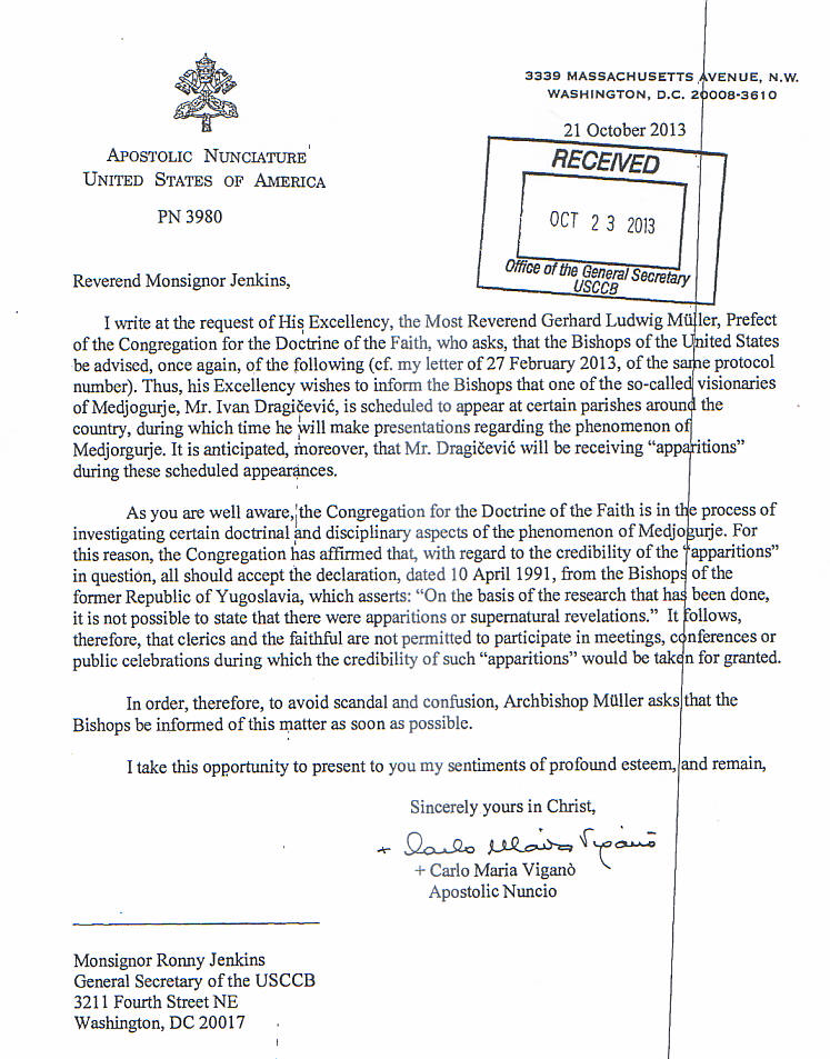 Nu, op 21 oktober laatstleden werd er een brief van de Apostolische Nuncio Carlo Mario Virgano, naar de bisschoppen in de VS gestuurd, naar aanleiding van enkele bijeenkomsten met de ziener Ivan. Er wordt een decreet aangehaald van 1991 van de bisschoppen van Joegoslavië waarin staat: “Op basis van het onderzoek dat werd gedaan is het niet mogelijk om te zeggen dat er verschijningen of bovennatuurlijke openbaringen waren.” Het vervolgt dat daarom, de clerus en de gelovigen niet toegestaan wordt om deel te nemen in ontmoetingen, conferenties, of publieke vieringen waarbij de geloofwaardigheid van deze “verschijningen” als vanzelfsprekend wordt aangenomen. De bijeenkomsten werden geannuleerd.