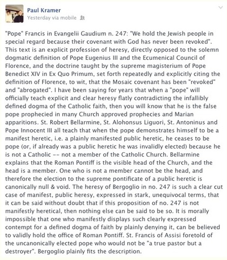 Paus Franciscus schreef in Evangelii Gaudium bij no. 247 : ” We hebben bijzondere aandacht voor de Joden omdat hun verbond met God nooit herroepen werd. ” Volgens Kramer , deze is deze tekst “een expliciete uiting van ketterij , direct tegengesteld aan de plechtige definitie van het dogma van paus Eugenius III en de Oecumenische Raad van Florence , en met de leer onderwezen door het opperste leergezag van paus Benedictus XIV in Ex Quo Primum , waarin hij herhaaldelijk en uitdrukkelijk citeerde dat het Mozaïsche Verbond is herroepen en ingetrokken.”