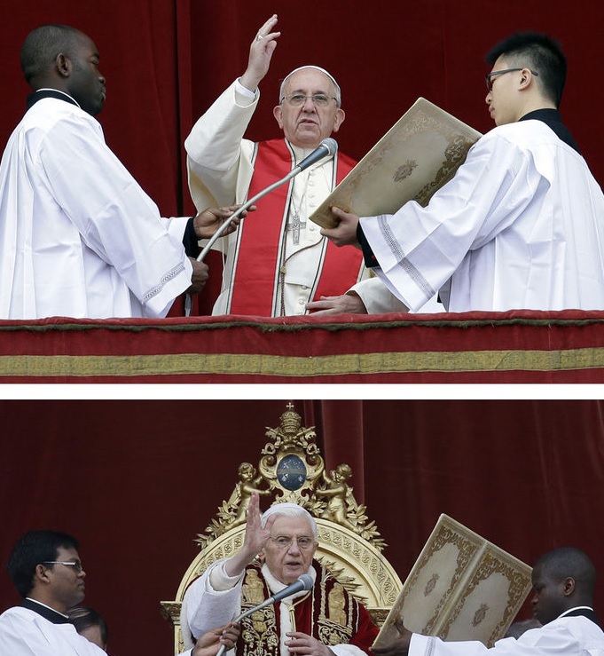 Boven: Paus Franciscus en onder Paus Benedictus