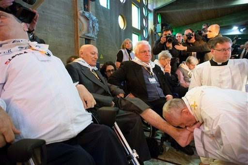Paus Franciscus zette zichzelf zoals gewoonlijk weer in de kijker en ging op Witte Donderdag 17 april 2014 de H. Mis in de gehandicapten instelling Don Gnocci vieren, in Rome. Hij waste er de voeten van 12 gehandicapten, mannen en vrouwen, van verschillende religies, en van leeftijden van 16 tot 86 jaar. Daartussen zat ook een 75-jarige Moslim. Hoogstwaarschijnlijk heeft hij ze dan ook de H. Communie uitgereikt.