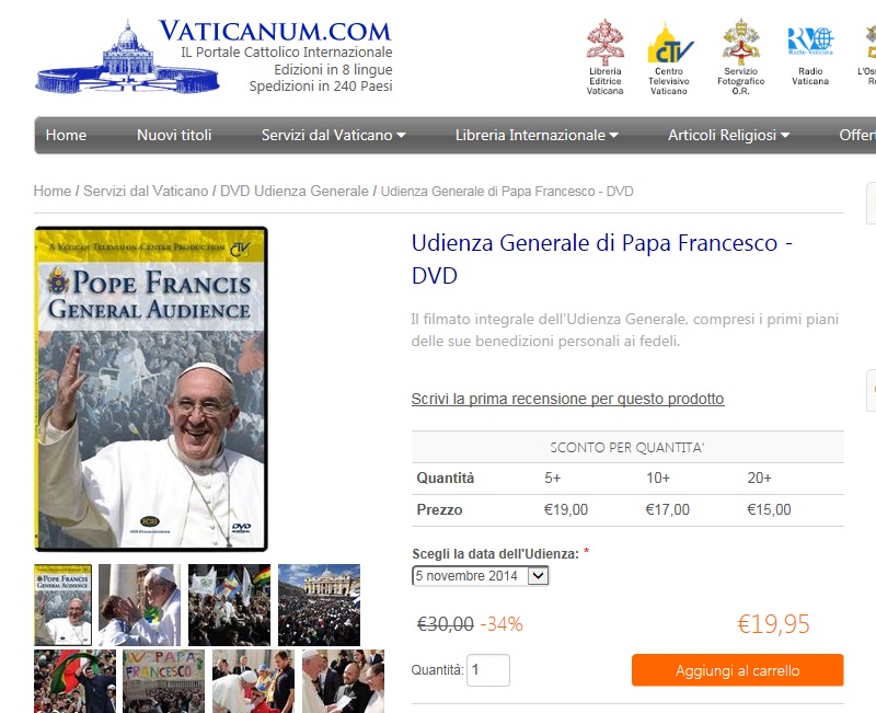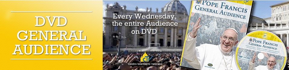 Het Vaticaans Televisiecenter (CTV) presenteert een nieuwe service voor de gelovigen die naar Rome kwamen om paus Franciscus te ontmoeten: de officiële DVD van de Algemene Audiëntie van de Heilige Vader, met de exclusieve beelden gefilmd door het Vaticaans Televisiecenter. De DVD bevat de hele film van de Algemene Audiëntie: het binnenkomen, de lezing van de Schrift, de catechese van de paus [!], zijn begroeting van de groepen gelovigen van over heel de wereld, zijn zegen. En er is nog meer, enkel op deze DVD kunt u de volledige film vinden van al de ontmoetingen en persoonlijke zegeningen van de Heilige Vader nadat hij de Algemene Audiëntie heeft gesloten. De DVD kan gelezen worden door alle DVD spelers wereldwijd.