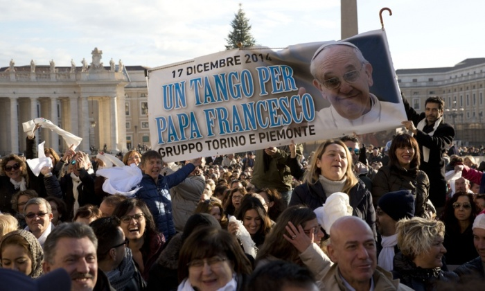 Bergoglio werd op 17 december 79 jaar. Ter gelegenheid van zijn verjaardag hebben gisteren 3000 tangodansers zich verzameld op het St-Pietersplein om voor Bergoglio de tango te dansen. Vorig jaar werd dit voor het eerst georganiseerd, omdat Bergoglio had gezegd dat hij veel van de tango houdt en dat hij in zijn jeugd ook nog de tango heeft gedanst.