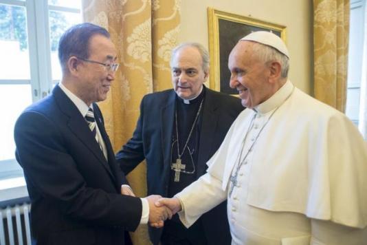 De VN is een instelling die nauw verweven is met de elite en de komende Nieuwe Wereld Orde; ze promoot geboortecontrole (abortus en contraceptie) en vaccins, om de wereldpopulatie in te dijken, en is in het bijzonder ‘bezorgd’ over de klimaatverandering en de armoede. Verschillende keren al had Bergoglio een ontmoeting met de VN-secretaris Ban Ki Moon. Die zei in september 2015 dat Bergoglio een nederige man van de mensheid is en dat de wereld zijn morele stem nodig heeft. Ban Ki Moon had ook veel lof voor de klimaatencycliek van Bergoglio ‘Laudato Si’.