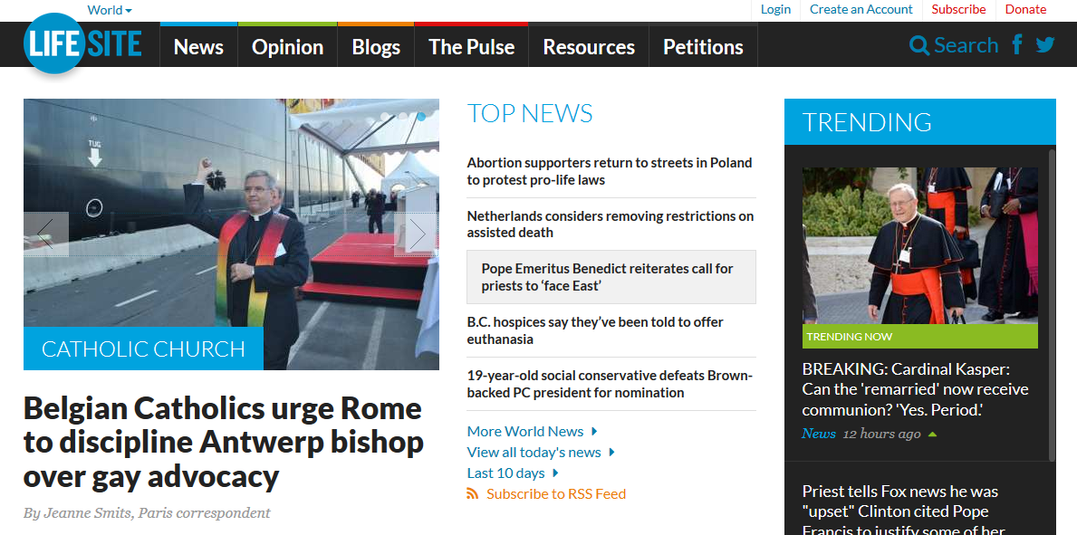 Life Site schrijft: “Pro Familia, een Belgische vereniging van Katholieke leken, heeft besloten om op te treden tegen het publieke standpunt gemaakt door de Antwerpse Bisschop Johan Bonny, die in een nieuw boek dat vrijdag werd gepubliceerd, suggereert dat homoseksuele koppels, hertrouwde gescheidenen en samenwonende koppels een kerkelijke zegen zouden moeten ontvangen, als onderdeel van een “diversiteit” van rituelen dat de “exclusiviteit en stabiliteit” van hun verbintenis zou erkennen. ”