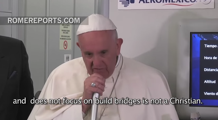 Bergoglio zei toen: “Een persoon die enkel denkt aan het bouwen van muren, waar ze ook mogen zijn, en niet aan het bouwen van bruggen, is niet christelijk.” Bergoglio maakte duidelijk dat hij “geen advies” gaf aan de Amerikanen om voor een bepaald iemand te gaan stemmen. “Ik ga me hier niet mee bemoeien. Ik zou enkel willen zeggen dat deze man niet christelijk is als hij zo’n dingen heeft gezegd.”