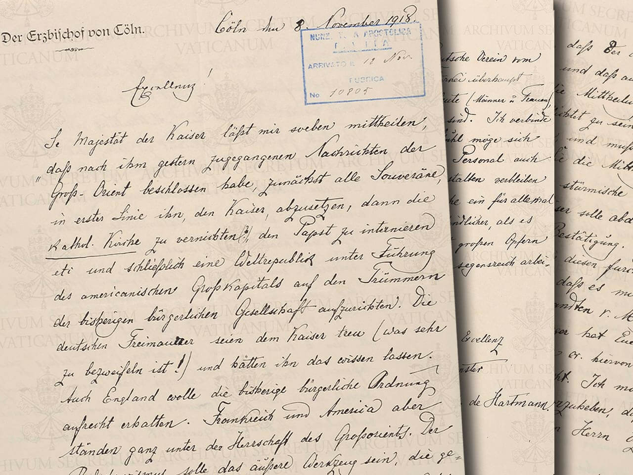 Zijne Majesteit de Keizer heeft mij juist laten weten dat “volgens het nieuws dat hem gisteren bereikte, de Groot Oriënt net heeft beslist om alle Soeveine monarchen op te heffen – eerst en vooral hem, de keizer, en dan de Katholieke Kerk te vernietigen, de paus gevangen te nemen etc, en uiteindelijk op de ruïnen van de vroegere burgerlijke samenleving een wereldrepubliek op te richten onder het leiderschap van het Amerikaans Grootkapitaal. De Duitse Vrijmetselaars zijn ogenschijnlijk trouw aan de Duitse Keizer (wat te betwijfelen is) en ze informeerden hem daarover. Engeland wil ook de huidige maatschappij behouden. Frankrijk en Amerika echter, schijnen onder invloed van de Groot-Oriënt te zijn. Bolsjevisme zou het uitwendige middel zijn om de gewenste condities tot stand te brengen. In het zicht van zo’n groot gevaar, die naast de Monarchie ook de Katholieke Kerk bedreigt, is het dus belangrijk dat het Duitse episcopaat hiervan op de hoogte wordt gebracht, en dat ook de paus wordt gewaarschuwd.” Tot dusver de boodschap van Zijn Majesteit. Ik vond het mijn plicht om dit naar Uwe Excellentie door te zenden, en ik laat het aan uw oordeel over, of u deze boodschap aan Rome wenst door te geven. […] Moge God ons en Zijn Heilige Kerk beschermen in deze vreselijke chaos! […] Met de uiterste devotie en tot beschikking zijnde van Zijne Excellentie,