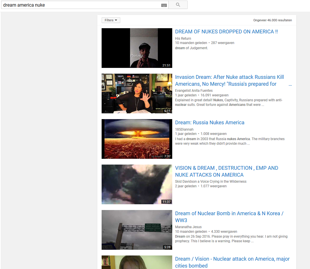 Als men op Youtube intikt “dream america nuke” krijgt men 46.000 resultaten, waaronder heel wat video’s van mensen die een droom hadden over Amerika die aangevallen wordt met atoombommen. Sommigen hadden ook een droom over een Russische en/of Chinese invasie.