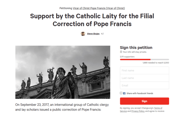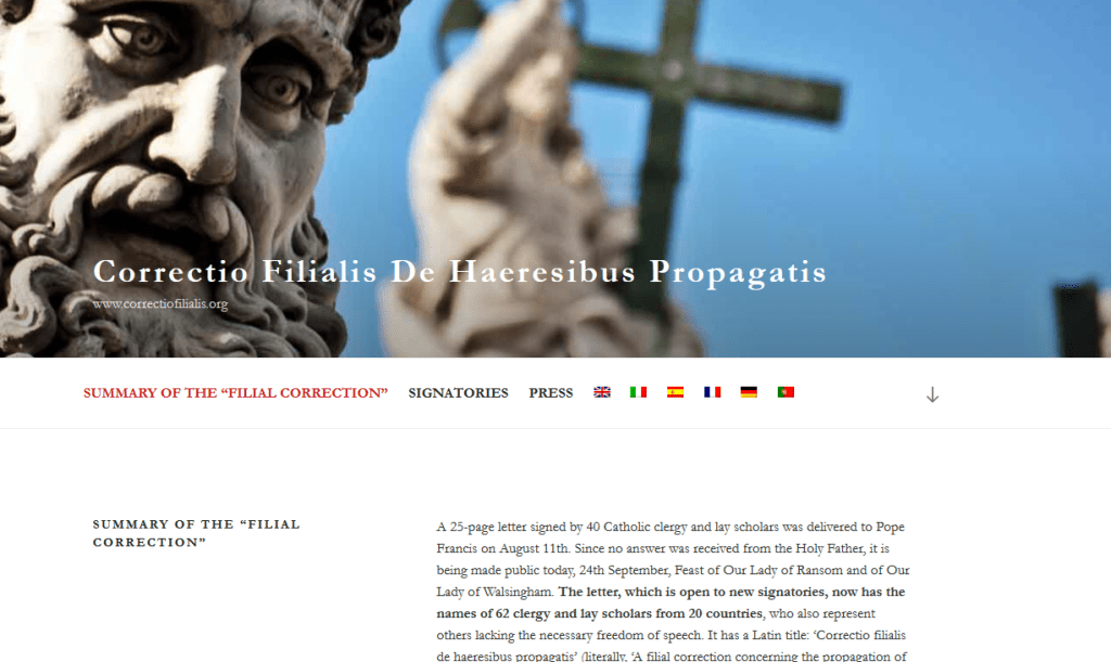 Er zit bij deze “Correctio filialis” wel een addertje onder het gras, want die wordt aan een paus gestuurd, wat in dit geval impliceert dat men Bergoglio erkent en bevestigt in zijn ambt als paus (wat hij dus niet is).