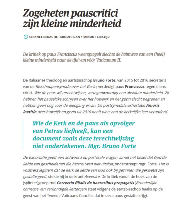 Het artikel van Kerknet begint met te benadrukken dat de critici slechts een heel kleine minderheid zijn, die heimwee hebben naar de tijd van voor Vaticanum II. Verder in het artikel worden ze een splintergroep genoemd. Aan het woord is Bruno Forte, één van die nauwe vertrouwelingen van Bergoglio tijdens de familiesynodes en vurig verdediger van Amoris Laetitia. De “geest” van het Tweede Vaticaans Concilie krijgt volgens deze ‘bisschop’ gestalte in Bergoglio. Bijgevolg staat deze brief dan ook haaks op het Tweede Vaticaans Concilie en is ze daarom verwerpelijk. De critici worden dus afgedaan als een groep extreem traditionalistische “marginalen”, wat uiteraard totaal onjuist is.
