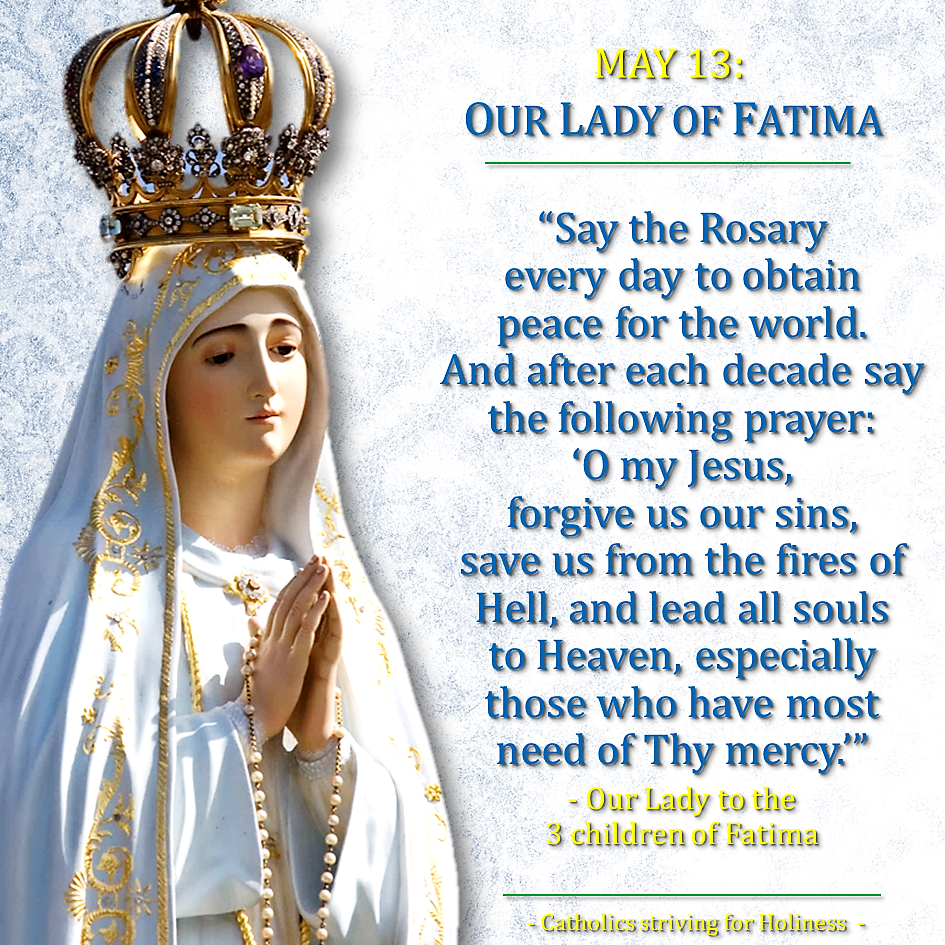 In 1917 vroeg O.L.Vrouw aan de herdertjes van Fatima, en aan alle mensen, om dagelijks de Rozenkrans te bidden en daarbij ook het bekende Fatimagebed te bidden: “O, mijn Jezus, vergeef ons onze zonde, behoed ons voor het vuur van de Hel. Breng alle zielen naar de Hemel, vooral diegenen die Uw barmhartigheid het meest nodig hebben.”