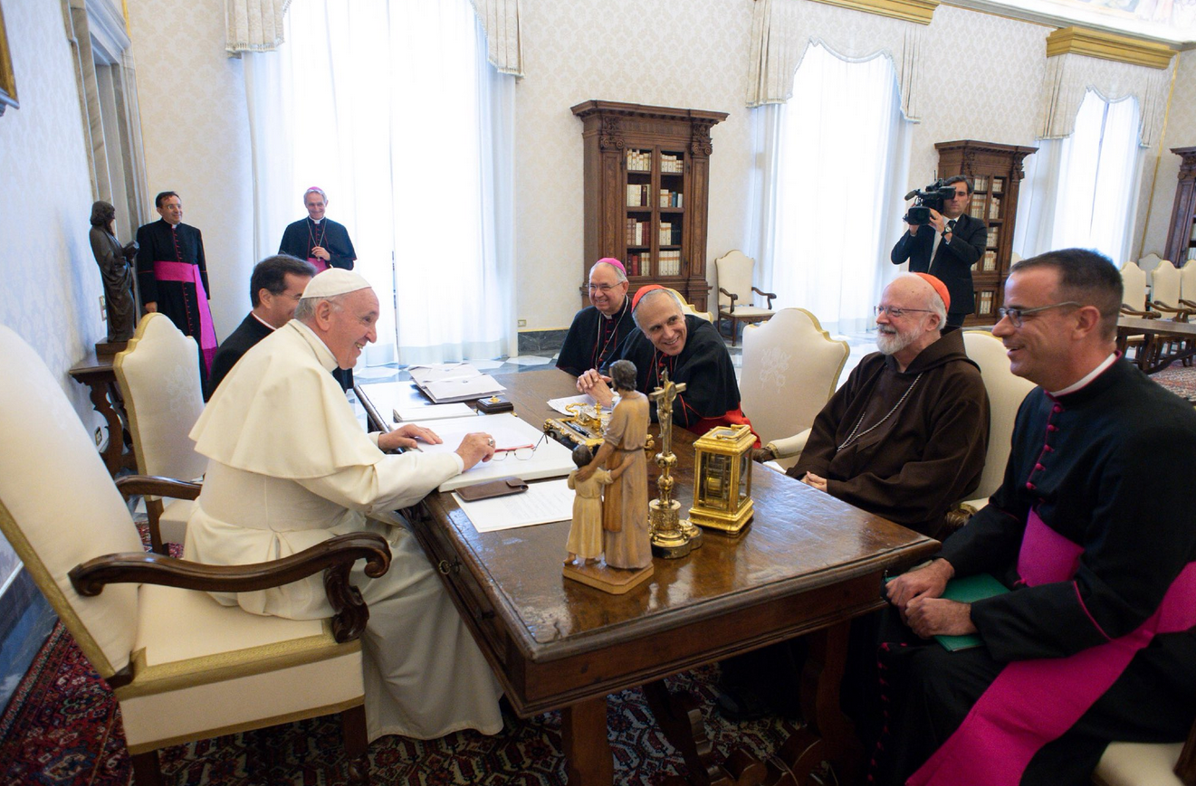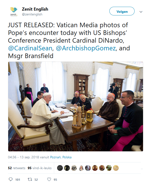 Zenit tweette gisteren één van de vrijgegeven foto’s met als commentaar: “NET VRIJGEGEVEN: Vaticaanse Media foto’s van de ontmoeting van de Paus vandaag met de president van de Amerikaanse bisschoppenconferentie Kardinaal DiNardo, Kardinaal Sean, Aartsbisshop Gomez en Mgr. Bransfield.”