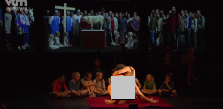 Ja, op openbare plaatsen. De schouwburg in Gent. Een live op het podium vrijend koppel (ze hebben écht seks!), met toekijkende kinderen eromheen en een toeziend publiek. WAL-GE-LIJK. En het werd niet alleen op de Standaard getoond met een foto, maar ook op alle andere nieuwssites, en ook op tv. Dit is een screenshot van vtm nieuws (bedekkend vierkant door ons):