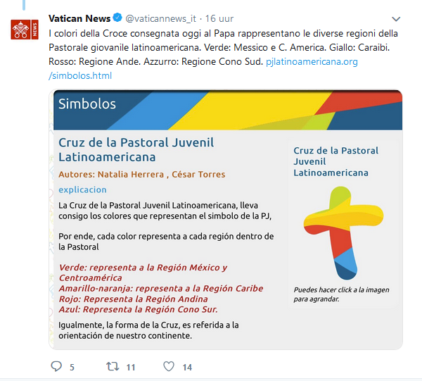 De officiële uitleg van het Vaticaan luidt dat de kleuren symbool zouden staan voor de verschillende regio’s in Zuid-Amerika, en dat dit kruis “het kruis van Jongerenpastoraal in Zuid-Amerika” is.