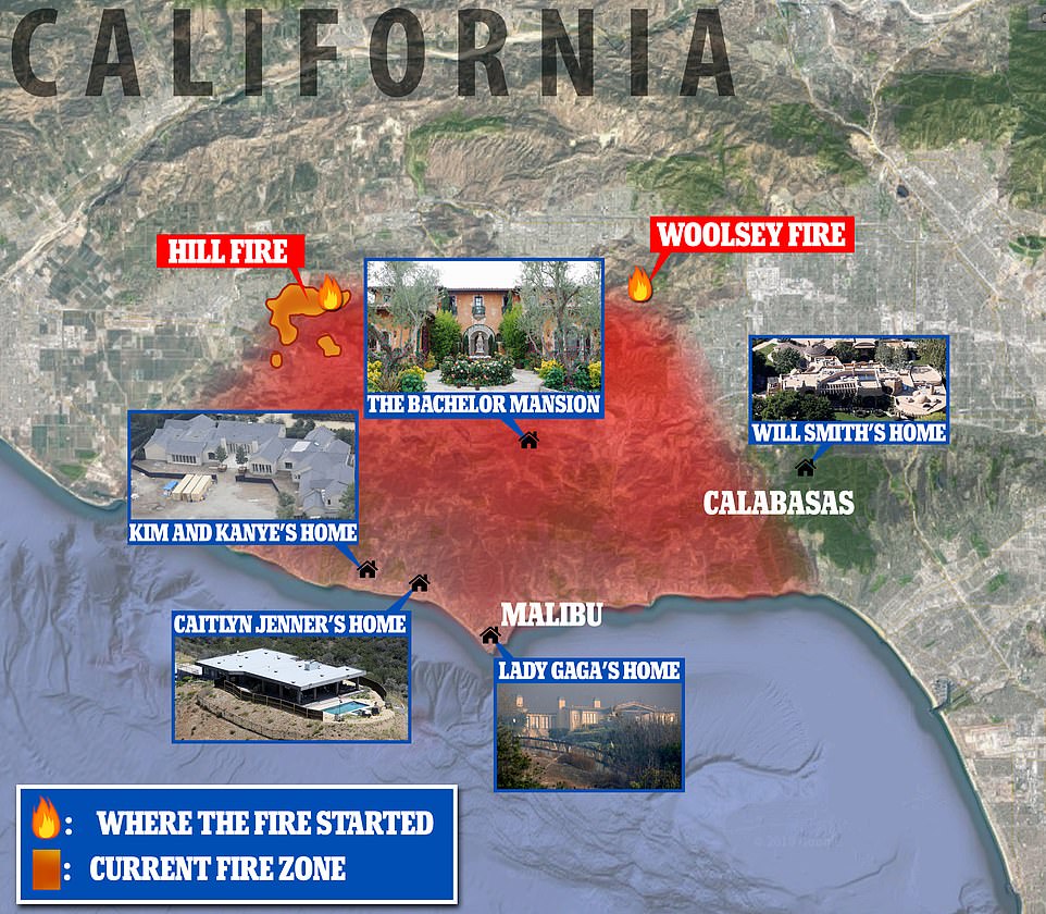De ‘Woolseybrand’ in Zuid-Californië heeft reeds de bekende ‘Bachelor Mansion’ en woonst van Kim Kardashian en Kanye West bereikt in Calabasas, en heeft reeds 35.000 hectare in de as gelegd. Andere leden van de Kardashian familie moesten ook hun woonst verlaten. De woonst van Caitlyn Jenner (Amerika’s meest bekende transgender) in Malibu lag eveneens in het pad van een bosbrand, alsook de villa’s van Will Smith en Lady Gaga. Andere celebrities die getroffen werden omvatten Neil Young, Miley Cyrus, Cher, Denise Richards en de voormalige Amerikaanse voetbalster Eric Wynalda, die zijn dure villa zag afbranden op de televisie. Eer zijn reeds honderdduizenden geëvacueerd uit de bedreigde gebieden.