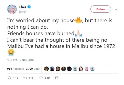 Cher, een bekende Amerikaanse zangeres en actrice postte op twitter: “Ik ben bezorgd over mijn huis, maar er is niets dat ik kan doen. Huizen van vrienden zijn afgebrand. Ik kan de gedachte dat er geen Malibu meer is, niet dragen. Ik heb een huis in Malibu gehad sinds 1972.”