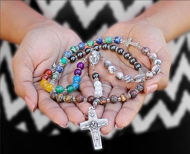 De eerste drie weesgegroetjes worden gebeden voor de slachtoffers van schietgeweld. Het eerste tientje wordt gebeden voor de vrouwen en hun kinderen, geboren en ongeboren, de vrouwen die met seksueel geweld te kampen hebben, en ongelijkheid (vb. op gebied van lonen); het tweede voor moeder aarde en de dieren – met een bezinning van Bergoglio uit zijn milieu-encycliek Laudato Si; het derde voor de migranten en de vluchtelingen; het vierde voor diegenen die gediscrimineerd worden omwille van hun huidskleur; en het vijfde voor het verwelkomen van LHBT-mensen in alle kerken, synagoges, moskeeën en tempels, voor hun “kinderen”, en dat ze ieder aspect van hun leven ten volle mogen beleven. Op de Tau-kruisen wordt gebeden voor de slachtoffers van mensenhandel.
