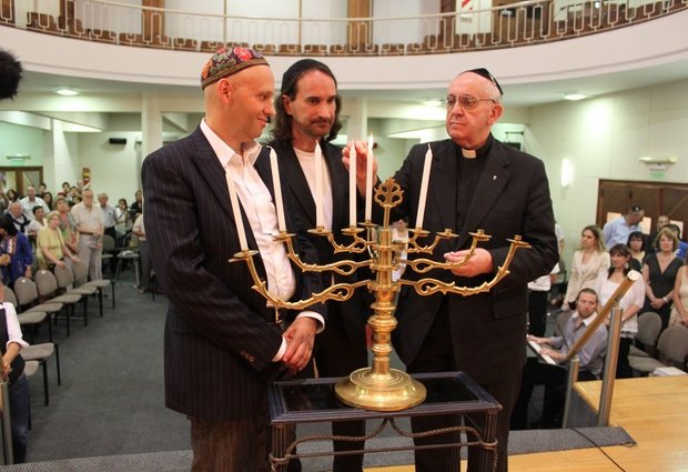 Hier ziet u Sergio Bergman, samen Bergoglio en nog een andere Jood tijdens een interreligieuze gebedsdienst in Buenos Aires in 2012. Merk op dat Bergoglio een keppeltje droeg: