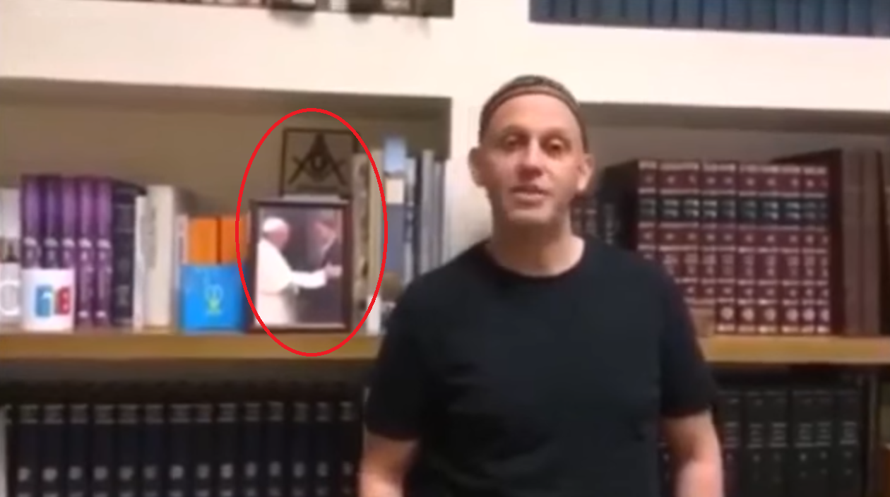Hier ziet u Bergman in een screenshot van een youtubevideo, met op de achtergrond een foto van Bergoglio met daarboven het vrijmetselaarssymbool: