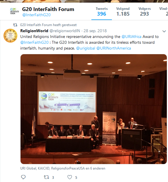 Het G20 Intergeloofsforum kreeg eind september een prijs van United Religions Intiative, vanwege hun inspanningen voor interreligie, menselijkheid en vrede.