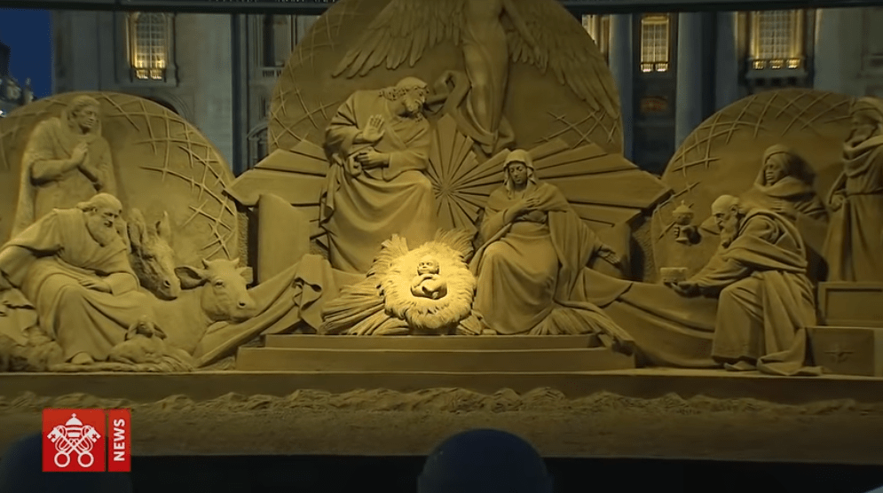 Nog een doordenkertje: deze scène, onder Bergoglio, is van zand (een andere was een ingestorte koepel). De scènes uit Benedictus’ tijd waren voornamelijk grotten met normale taferelen: