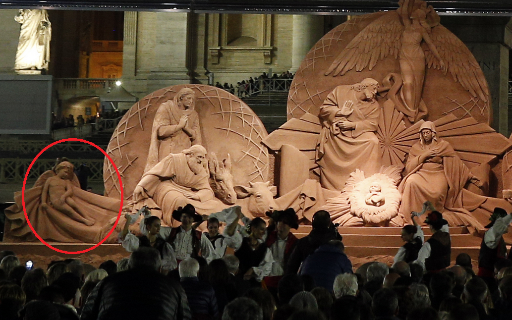 Er gaat geen jaar meer voorbij zonder dat er wel iets mankeert aan de Kerstscène die ze in het Vaticaan opzetten. Vorig jaar was er de naakte gespierde Adonis die in het oog sprong, en dit jaar is het weer iets. Onze redactie kwam ervan op de hoogte dankzij een reportage van Café con Galat, van de Colombiaanse (zogezegd geëxcommuniceerde) tv-presentator José Galat.