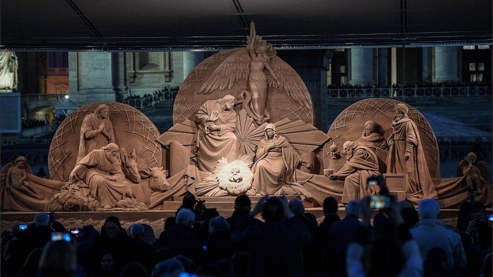 Nog een doordenkertje: deze scène, onder Bergoglio, is van zand (een andere was een ingestorte koepel). De scènes uit Benedictus’ tijd waren voornamelijk grotten met normale taferelen: