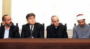 Van links naar rechts: rabbi Daniel Goldman, rabbi Abraham Skorka, kardinaal Jorge Bergoglio en imam Omar Abboud.