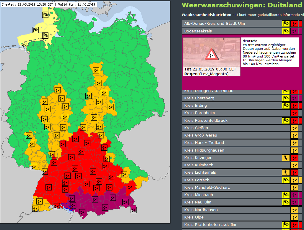 Momenteel is er zware regenval met overstromingen in delen van Duitsland, Polen en andere delen van Oost-Europa. Vooral zuid-Duitsland wordt zwaar getroffen. Meteoalarm kondigde code rood en code paars af voor overstromingen, met geschatte neerslaghoeveelheden tot 140 l/m². Ook in Oostenrijk, in Tirol wordt gewaarschuwd voor overstromingen, en wordt 120 l/m² verwacht.