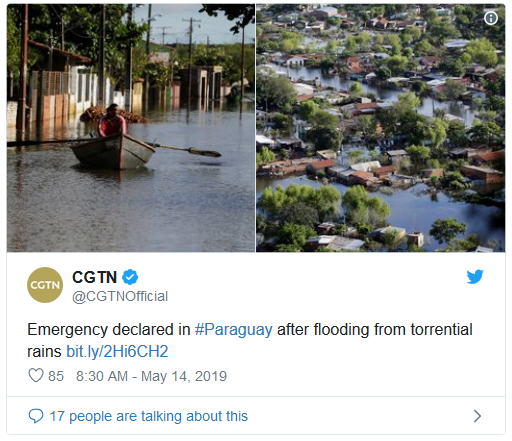 In Paraguay werd onlangs de noodtoestand afgekondigd nadat rivieren buiten hun oevers traden wegens aanhoudende zware regenval sinds begin april. Er zijn reeds 16 doden gevallen en ruim 12.000 families moesten hun huizen verlaten.