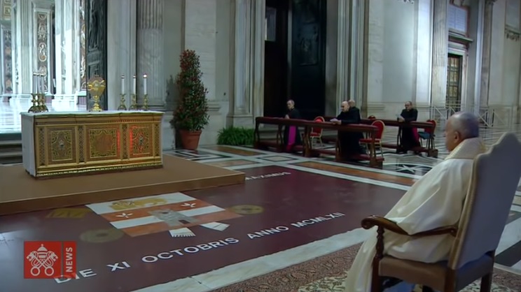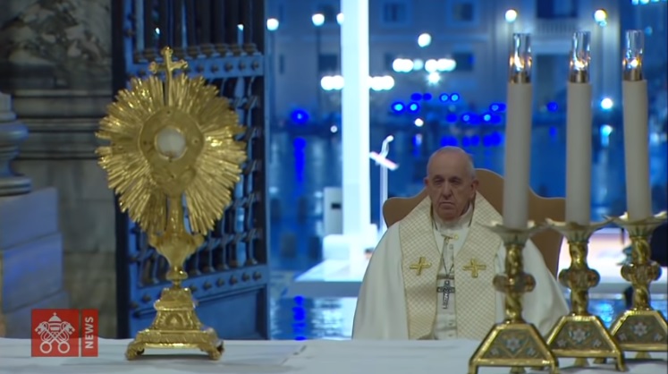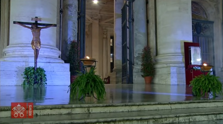Afgelopen vrijdag, 27 maart 2020, hield Jorge Bergoglio een buitengewoon gebedsmoment in het Vaticaan om aan God een einde te vragen van de Coronapandemie. Hiervoor had Bergoglio een 16de-eeuws Miraculeus Kruis laten overbrengen van de Kerk van San Marcello al Corso in Rome. Verder was er ook een moment van Eucharistische aanbidding.