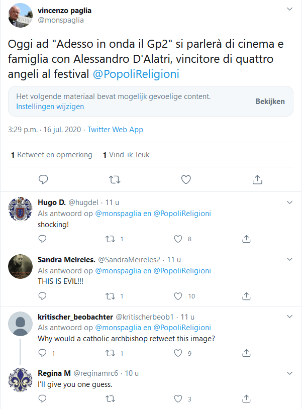 De prominente Vaticaanse Aartsbisschop Vincenzo Paglia, (door Bergoglio benoemde) President van de Pauselijke Academie voor het Leven en Kanselier van het nieuwe Paus Johannes Paulus II-instituut voor Huwelijks- en Familiewetenschappen (beter bekend als het “Amoris Laetitia-Instituut”) in Rome, heeft op twitter een foto gepost van een naakt koppel met naakte kinderen. Het is niet de eerste keer dat deze man in opspraak komt.