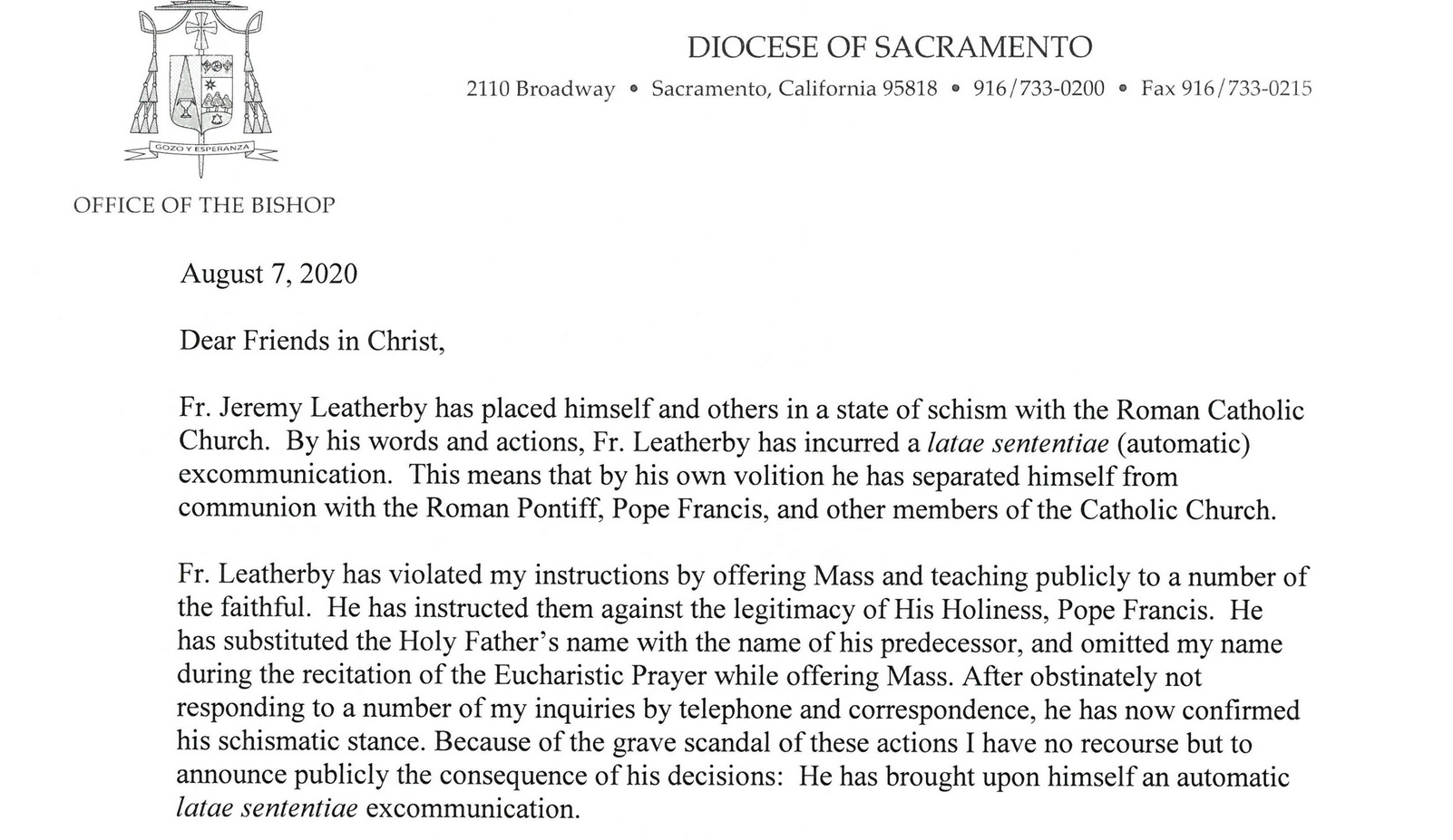 In een brief daterend van 7 augustus kondigdt Bisschop Jaime Soto van Sacramento aan dat vader Leatherby zich had losgemaakt van de “eenheid met Franciscus.” Hij beschuldigt Leatherby ervan gelovigen tegen Franciscus te hebben opgezet, de naam van Benedictus XVI tijdens de H. Mis te hebben vernoemd, en de naam van de bisschop te hebben weggelaten tijdens de Mis. Hierop kreeg de priester van zijn bisschop de straf van “automatische excommunicatie.”