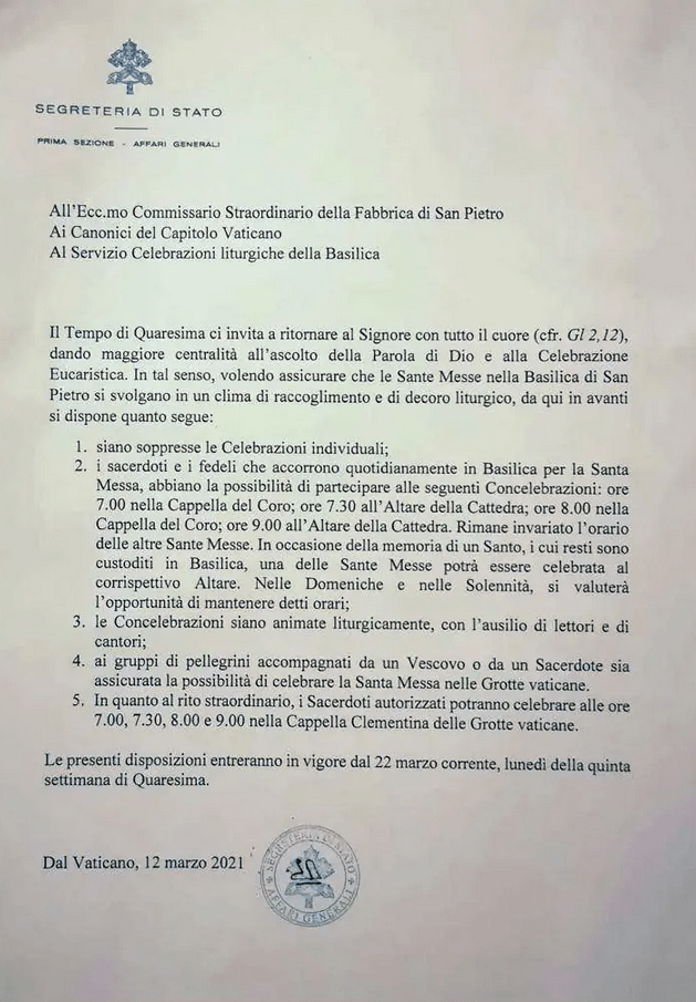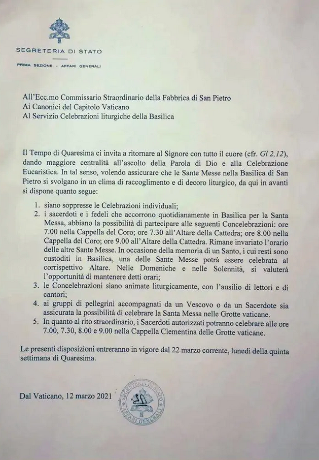 Het Vaticaanse Staatssecretariaat – dat onder leiding van Kardinaal Parolin nauw samenwerkt met Bergoglio (cf. China-Vaticaan deal) – heeft middels een decreet ALLE private [gelezen] Missen in de Sint-Pietersbasiliek verboden. Alle (vastgestelde) Missen in de Sint-Pietersbasiliek zullen in de ‘Nieuwe Ritus’ MOETEN gecelebreerd worden (de Mis van Paulus VI van 1969), verlevendigd door voorlezers en zangers. Priesters die op bedevaart komen, kunnen CONCELEBREREN.