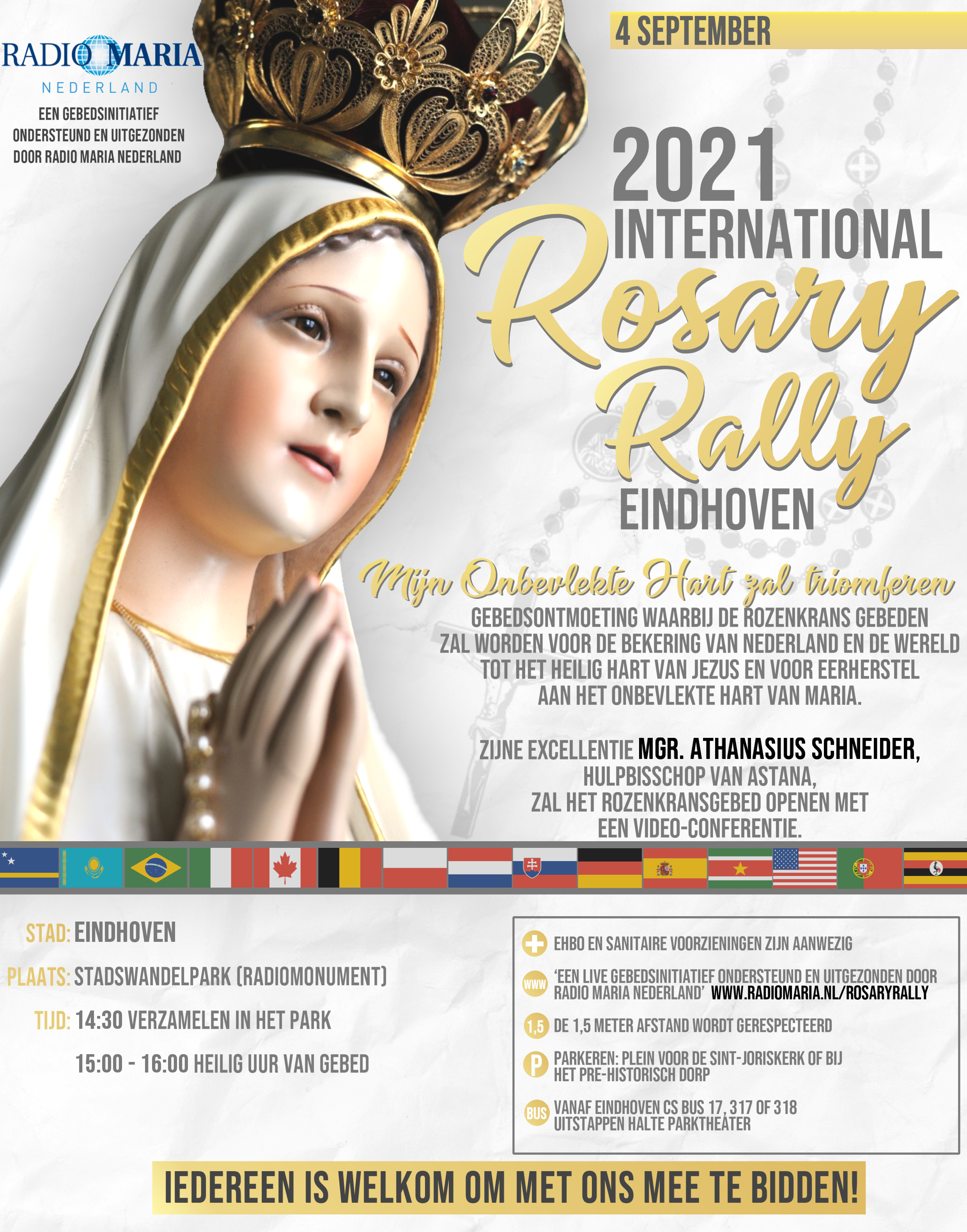 Mgr. Athanasius Schneider, hulpbisschop van Astana, zal het Rozenkransgebed openen met een video-conferentie. Radio Maria Nederland zal dit internationale gebedsinitiatief live uitzenden via DAB+, radiomaria.nl en de App. De gebedsbijeenkomst zal daarnaast (op de website van Radio Maria) live te volgen zijn via een youtube live-stream.