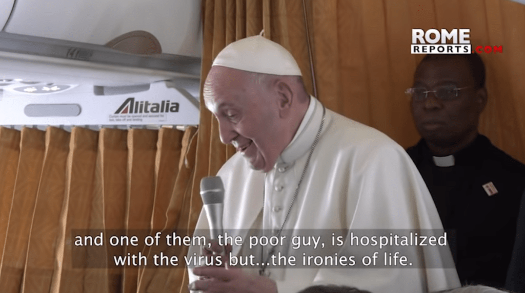 “Vele argumenten hebben geleid tot deze verdeeldheid. Zelfs in het College van Kardinalen zijn er sommige ‘vaccin-ontkenners’, en één van hen, de arme kerel, werd gehospitaliseerd met het virus….haha… De ironie van het leven.”