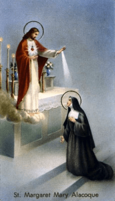 De Heilige Margaretha-Maria Alacoque, een Franse Rooms-katholieke Visitatie-zuster en mystica, staat alom bekend om haar toewijding aan het Heilig Hart van Jezus. Ze werd geboren in 1647 in Frankrijk als de enige dochter van Claude en Philiberte Lamyn Alacoque. Margaretha heeft altijd een intense liefde voor het Heilig Sacrament getoond en de voorkeur gegeven aan stilte boven typisch kinderspel. Ze begon ernstige lichamelijke versterving te beoefenen na haar eerste communie op 9-jarige leeftijd. Ze ging hiermee door totdat reumatische koorts haar vier jaar lang aan haar bed had gebonden. Na een gelofte aan de Heilige Maagd Maria te hebben afgelegd om zichzelf te wijden aan het religieuze leven, keerde Margaretha onmiddellijk terug naar een perfecte gezondheid. Als erkenning voor deze gunst voegde Margaretha de naam Maria toe aan haar doopnaam. Margaretha-Maria ervoer het grootste deel van haar leven visioenen van Jezus Christus, maar dacht dat ze een normaal onderdeel van het leven waren en bleef soberheid betrachten. Na de dood van haar vader werden Margaretha en haar familie tot armoede gedwongen toen een familielid weigerde de bezittingen van de familie af te staan. Margaretha’s enige troost in het leven waren haar frequente bezoeken in een plaatselijke kerk om te bidden voor het Heilig Sacrament. Op 17-jarige leeftijd kon Margaretha’s familie de controle over hun bezittingen terugkrijgen. Haar moeder begon haar aan te moedigen socialer te worden, in de hoop dat ze een geschikte echtgenoot zou vinden.
