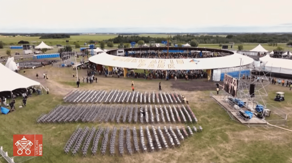 Bergoglio is momenteel in Canada, om zijn excuses te brengen aan de inheemse indiaanse bevolking (die zich verstokt blijft vastklampen aan hun heidense rituelen) voor een vermeende massagraf van inheemse kinderen in een katholieke residentiële school (er zijn nog géén overblijfselen gevonden!), en de zogezegde mishandeling die indianen door de hand van katholieke geestelijken zouden hebben ondergaan. Na de bekendmaking van die zogenaamde ontdekking vorig jaar werden tal van kerken in brand gestoken. Ondertussen wordt natuurlijk vergeten dat sommige van die indianenstammen bloeddorstige barbaren (kannibalen) waren.