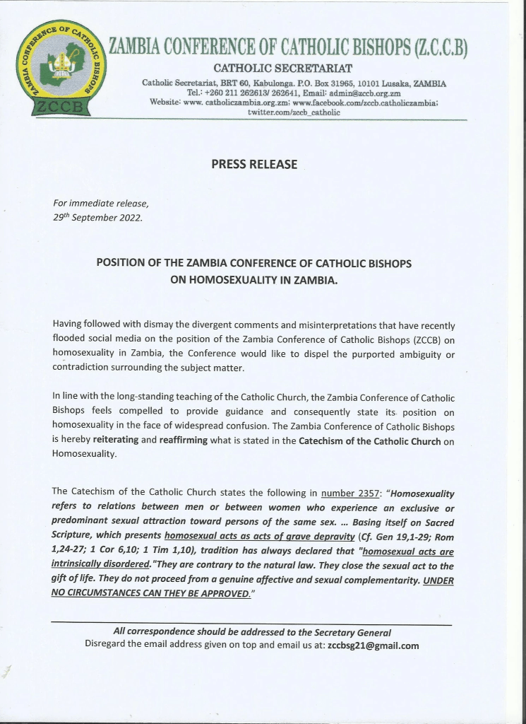 De verklaring is een reactie op de kritiek van aartsbisschop Alick Banda van Lusaka op de toename van illegale homopropaganda in het land.