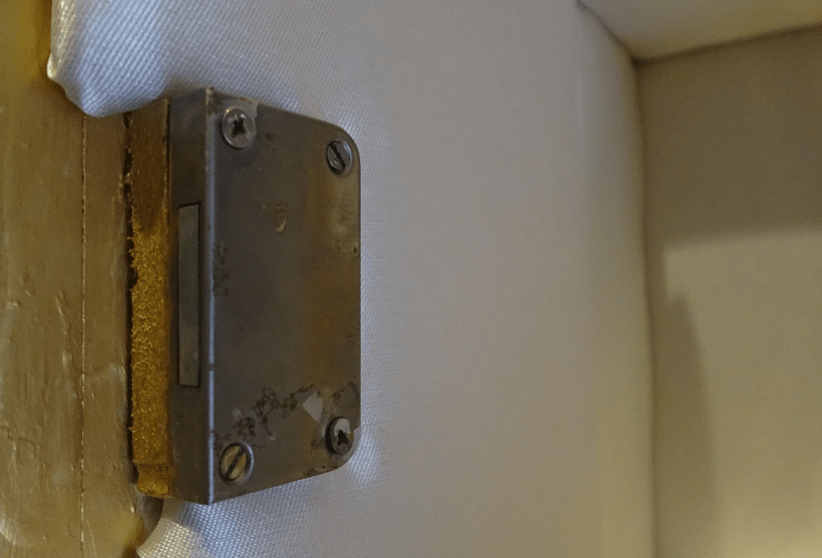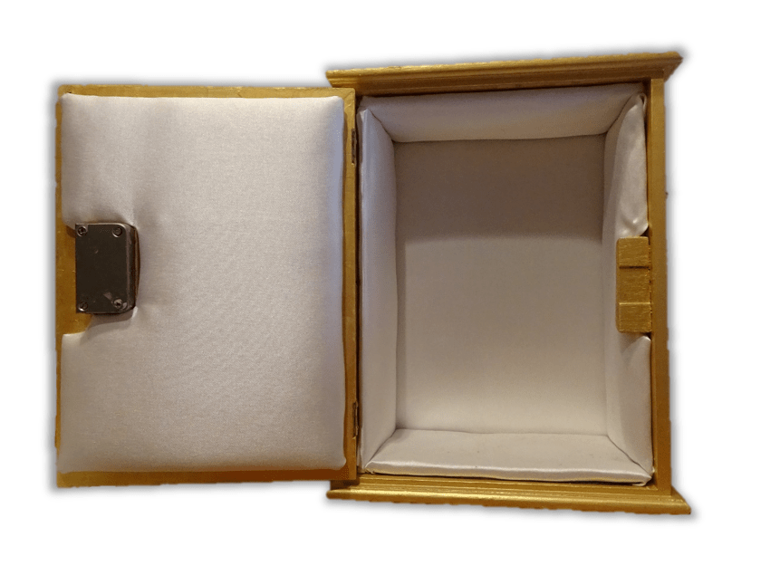 Men kan bvb. op Bol.com een geschikt kastje zoeken. Wij nemen als voorbeeld het ‘medicijnkastje’ van Clayre en Eef, met een formaat van 24x13x30 cm. Elders zijn er gelijkaardige kastjes te vinden. De afmetingen zijn perfect om te dienen als klein tabernakeltje. Sla de middenplank eruit en koop in de Hubo of een andere doe-het-zelf-zaak een slot met sleutel en een mooi sleutelgat (voor kasten e.d.). Monteer een plankje op de deur, om daarop het slot te monteren, en voorzie een houtje waarachter het slot kan gaan, zodat de deur dicht blijft na het sluiten (zie ook foto lager). Boor dan een gat door het plankje, waar het sleutelgat komt. Monteer dan het slot en het sleutelgat.